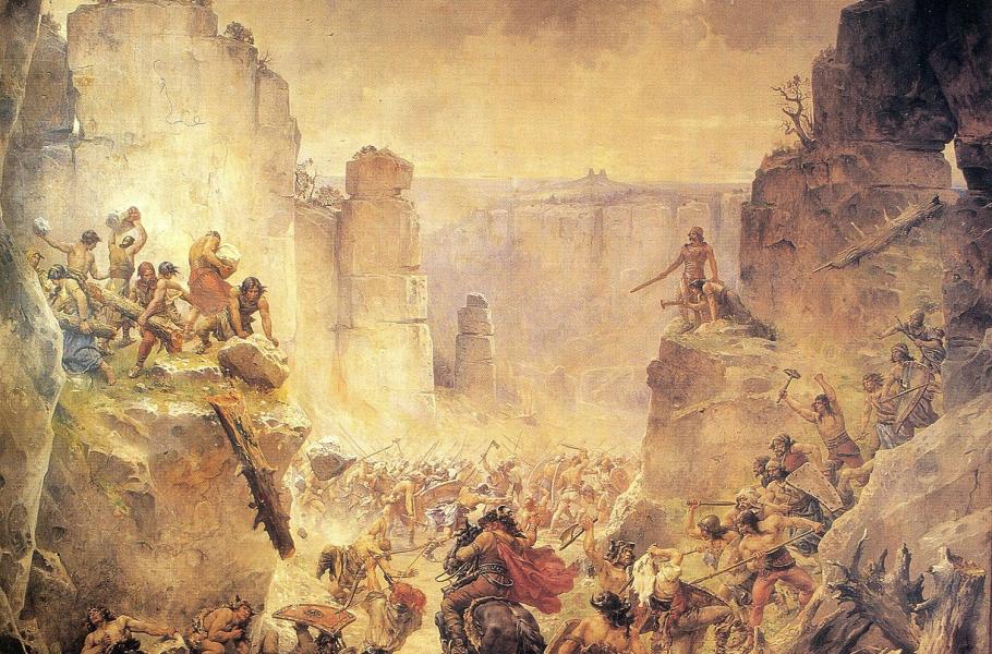Pobití Sasíků pod Hrubou Skálou – jeden z vylhaných příběhů z Rukopisu královédvorského. (ilustrace: Wikimedia Commons, Mikoláš Aleš, Vojtěch Bartoněk, Karel Vítězslav Mašek, Václav Jansa, CC0)