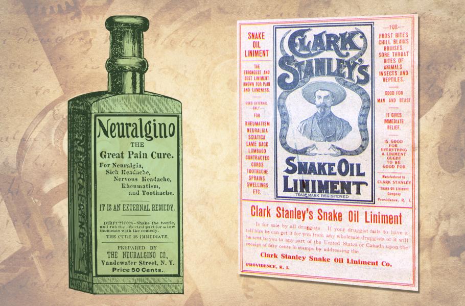 Myšlenku hadího oleje přivezli do USA čínští přistěhovalci koncem 19. století – v jejich domovině šlo totiž o tradiční medicínu. Vyráběla se však z druhů, které ve Spojených státech nežily, a tak se tamní podvodníci rozhodli získávat léčivo z chřestýšů. Mezi nejznámější patřil přípravek Clarka Stanleye, nicméně laboratorní rozbor v něm objevil pouze minerální oleje, 1 % tuku, výtažek z chilli papriček, terpentýn a kafr. Podobné složení měly i konkurenční směsi, a ze slovního spojení „hadí olej“ tak v průběhu let vzniklo synonymum pro podvodný produkt. (foto: Wikimedia Commons, CC0)