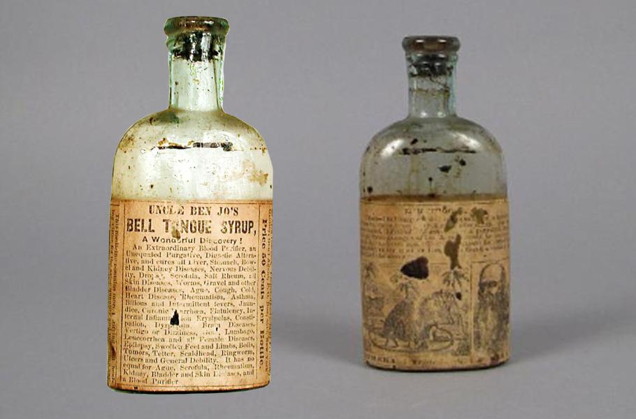Přípravek pojmenovaný „Jazykový sirup strýčka Bena Joa“ se na trhu objevil v 70. letech 19. století a hlavní přísadu měla tvořit zvonková okvětí tajemné andské rostliny: Údajně léčila takřka vše, na co si lidé vzpomněli – od plynatosti přes problémy s mozkem až po nádory a epilepsii. Podle reklamy i samotného obalu stačilo užívat třikrát denně půl lžičky a pevné zdraví bylo zaručeno. Samozřejmě se však jednalo o naprosto nefunkční produkt, na nějž se mimo jiné v časopise American Agriculturist hromadila jedna stížnost za druhou. (foto: Smithsonian, CC0 1.0)