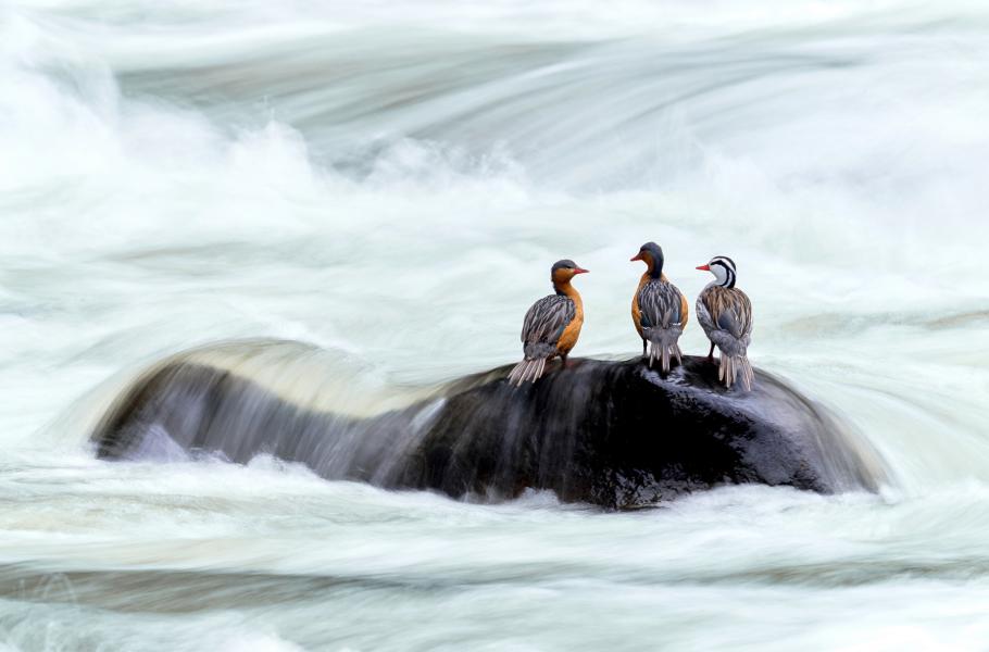 Autor zachytil skupinku kachen bystřinných v Andách. Ačkoliv vypadají nemotorně, skvěle se přizpůsobily životu v nadmořských výškách přes patnáct set metrů a dokážou obratně manévrovat i v dravých horských řekách. (foto: Czech Nature Photo, Petr Bambousek)