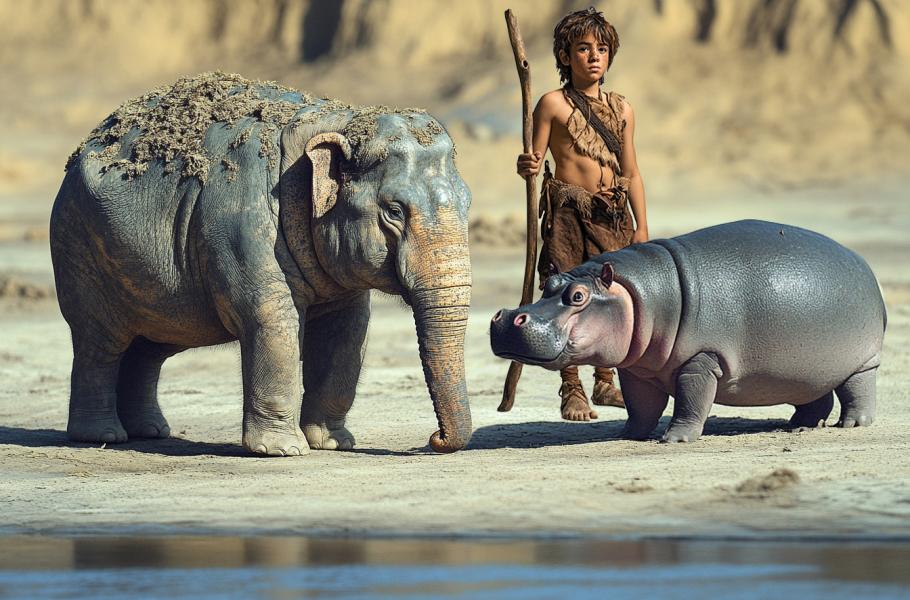 Podle vědců žilo před 13 tisíci lety na Kypru 3 až 7 tisíc lovců-sběračů, kteří zcela zlikvidovali tamní trpasličí megafaunu. (ilustrace: Midjourney AI, PDM 1.0)