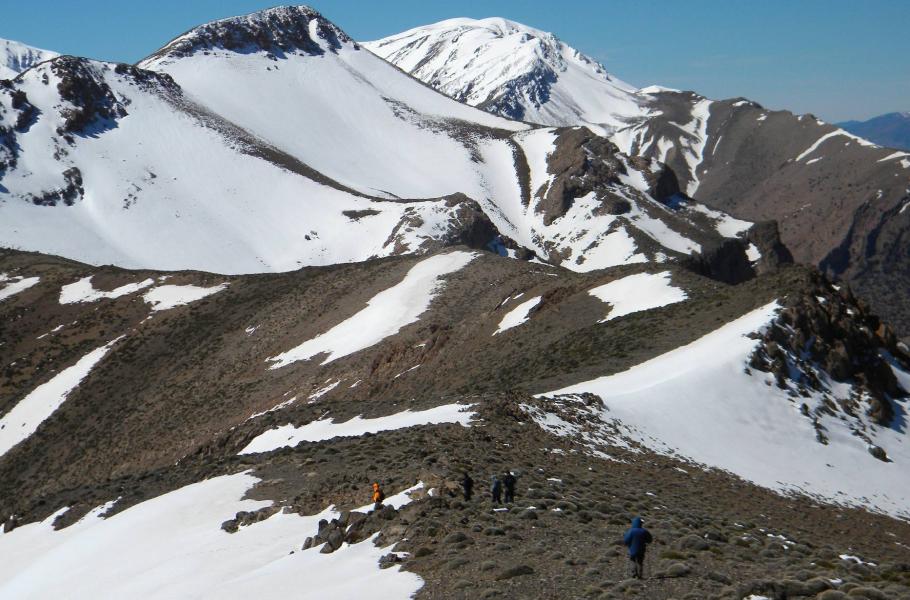 Vše leží pod několikametrovou přikrývkou sněhu. Namrzlý firn však perfektně drží, a tak se můžeme přímo po spádnici vydat vzhůru ke kobaltovému marockému nebi. Dosažení hřebene obrovského valu masivu Ayachi nebude normálně nijak tvrdý oříšek, ale za stávajících podmínek je postup od výšky kolem 3 000 metrů nesnadný. Strmý „betonový“ sníh nás zkrátka nepouští dál. I z této pozice lze ovšem přehlédnout značný kus krajiny a poznat, jakou geografickou strukturu celý tento poněkud opomíjený horský prostor vlastně má.