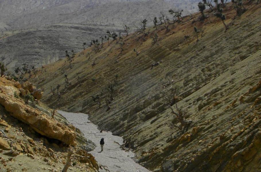 Ze sucha a tepla auta jsme pro špatnou sjízdnost vyhozeni na otevřené, větru a dešti vystavené pláni. Není to zrovna šťastný začátek, ale skalní amfiteátr Cirque de Jaffar naštěstí není daleko. Nacházíme jej spíše instinktivně, neboť automapa v měřítku 1:800 000 není žádné terno a pro pohyb v horách je spíše k smíchu. Ačkoli … elementární profil terénu zde je zaznamenán, tenké vlásenky lokálních cest také, takže lepší něco než nic. Déšť naštěstí ustal stejně rychle, jako začal a zdá se, že slunce nakonec svůj boj s mraky přece jen vyhraje. První pohled z okraje kotliny je ovšem spíše zklamáním. Po pravdě řečeno jsem čekal víc, ale krása mnohých koutů světa je skrytá a jejich skutečný půvab vyniká až postupně. A nejinak tomu je i v tomto případě.