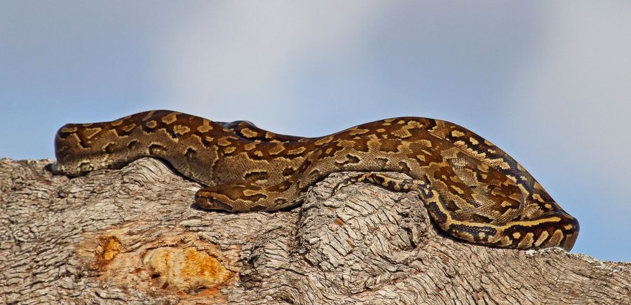 Krajta písmenková (Python natalensis) má nahnědlé zbarvení. Když se ale stará o mláďata, její kůže výrazně ztmavne, aby se mohla efektivněji nahřívat na slunci. (foto: Shutterstock)