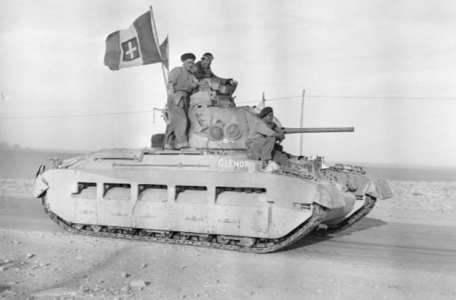 Matilda II spolu se svou britskou osádkou při vstupu do Tobruku v roce 1941. Italská vlajka představuje kořist.