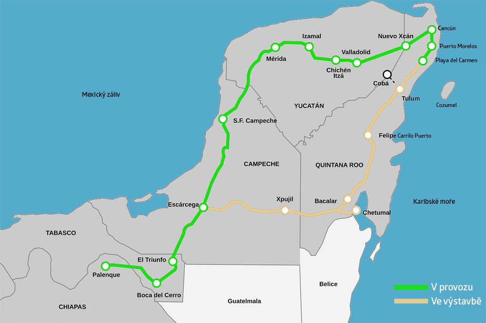 Mexická vláda si od zprovoznění trati v plánované délce přes 1 500 kilometrů slibuje posílení cestovního ruchu. Železnice má čítat dvacet zastávek a propojovat pět mexických států. První část mezi městy Palenque a Escárcega otevřel mexický prezident krátce před Vánoci; druhá křižuje stát Campeche a v provozu je od 31. ledna. Třetí část, spojující Cancún a Playa del Carmen, byla připojena na konci února. Další rozšíření má přijít na řadu v následujících týdnech – v srpnu část spojující Escárcega a Chetumal a v září má spojení uzavřít trasa z Playa del Carmen do Escárcega.
