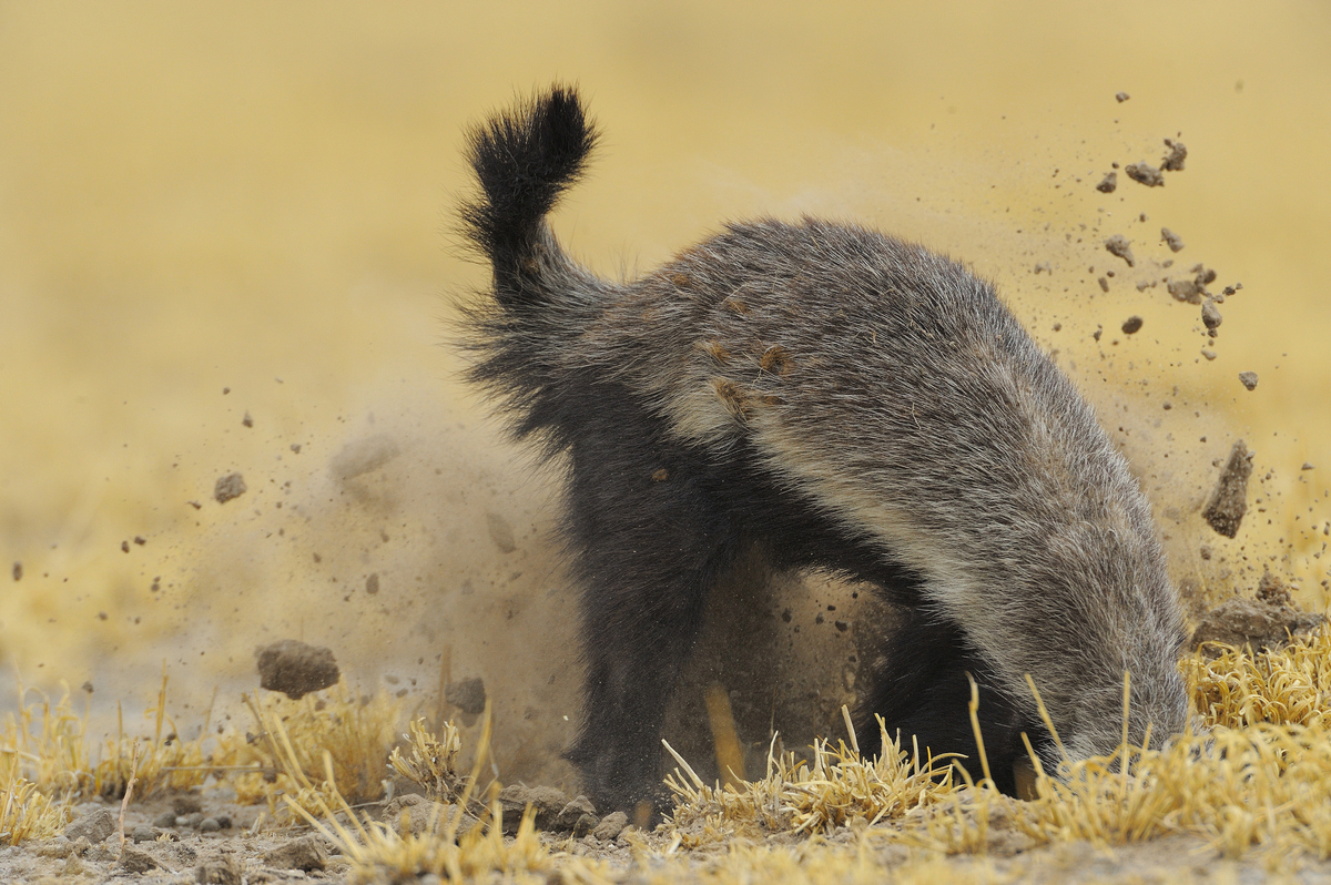 Medojed si dokáže obstarat potravu i v období sucha. Na tomto snímku je zachycen na poušti Kalahari při lovu škorpionů. (foto: Karel Maton ©)