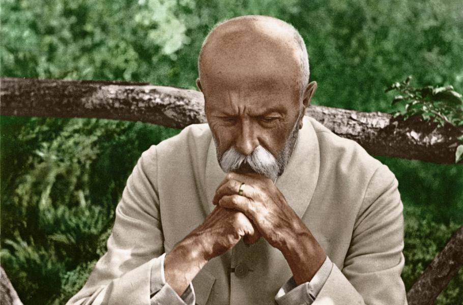 Zamyšlený TGM ve slovenských Topoľčiankách na snímku Karla Čapka kolorovaném pro knihu První republika v barvě.