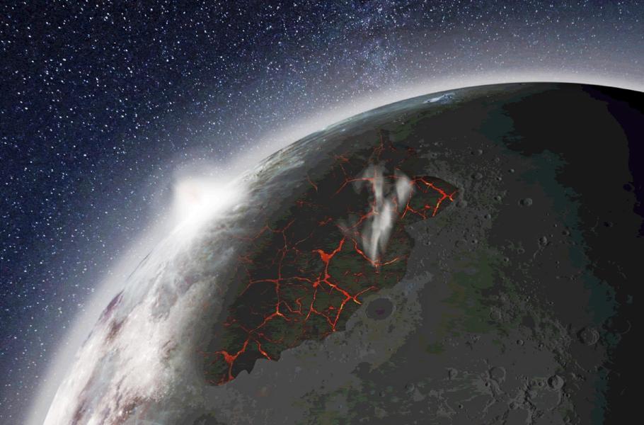 Před třemi až čtyřmi miliardami let, kdy vulkanické erupce chrlily nad lunární povrch obrovská oblaka plynu, obklopovala zřejmě našeho souputníka slabá atmosféra. (ilustrace: NASA MSFC, CC0)