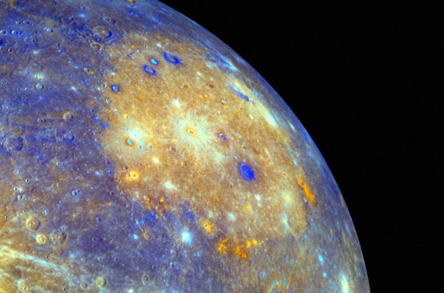 Pánev Caloris na snímku sondy Messenger v nepravých barvách. Průměr jedné z největších impaktních pánví ve Sluneční soustavě přesahuje 1 500 km