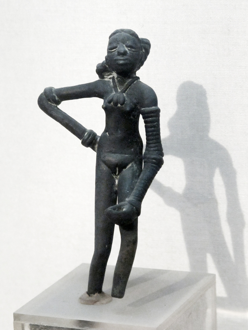 Archeologové objevili v Mohendžodáru mnoho dětských hraček i sošek. Opakoval se například motiv ženy s jakousi „čepicí“ ze dvou košíků. S největší pravděpodobností šlo o zpodobnění bohyně Matky. Jiným zajímavým nálezem je bronzová soška nahého děvčete s poněkud vyzývavým držením těla nazvaná Tančící dívka. „Nemůžeme si být jisti, že to byla tanečnice, ale byla dobrá v tom, co dělala, a věděla to,“ komentuje nález archeolog Gregory Possehl. Stejně neurčitelná je i elegantní mužská busta z mastku, jíž dali badatelé jméno kněz-král. (foto: Wikimedia Commons, Gary Todd, CC0 1.0)