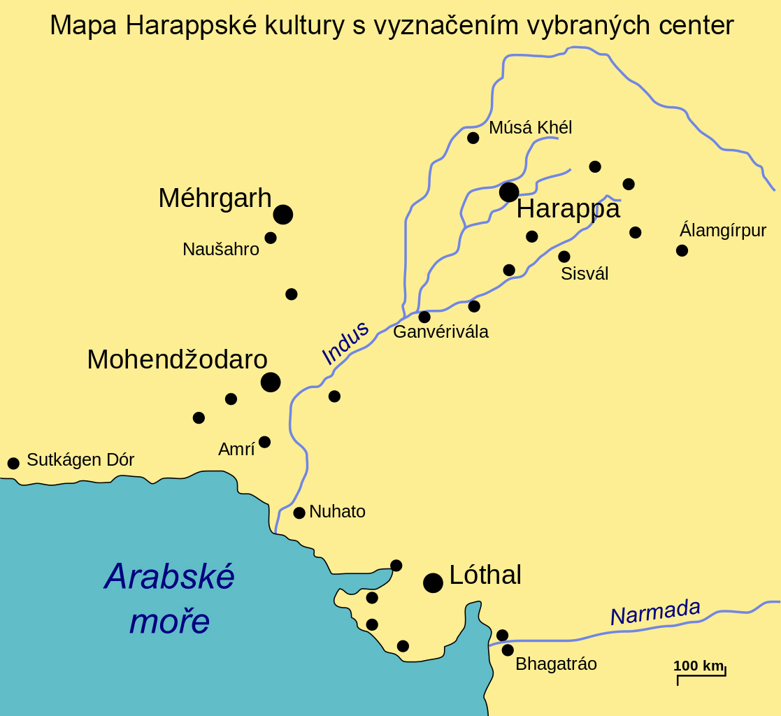 Mapa Harappské kultury s vyznačením hlavních a menších center (foto: Wikimedia Commons, Podzemnik, CC BY-SA 4.0)