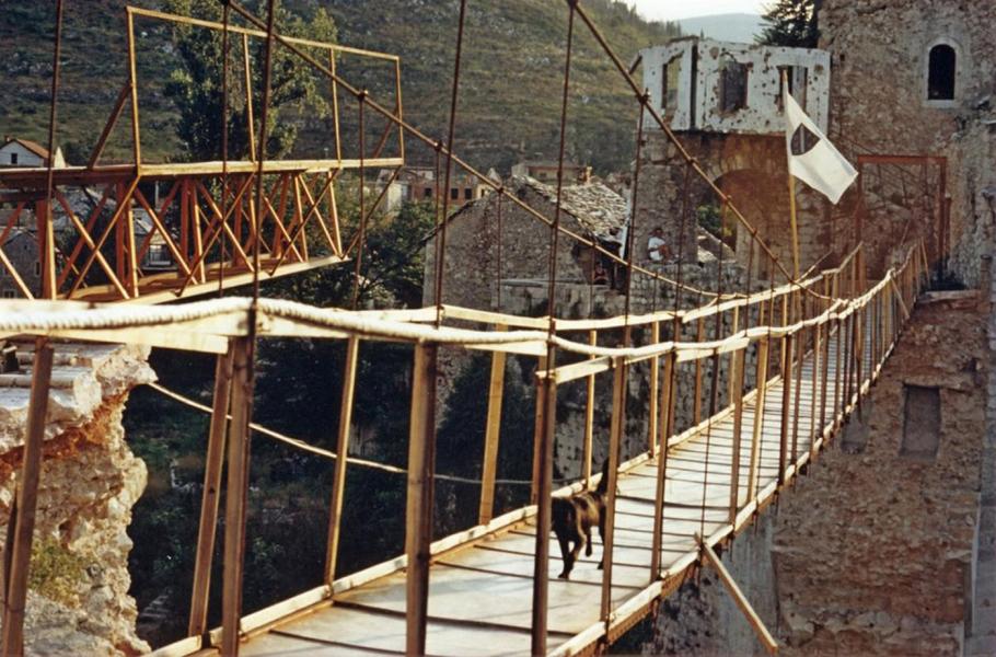 Most během bojů ještě předtím, než byl zcela zničen (rok 1993).