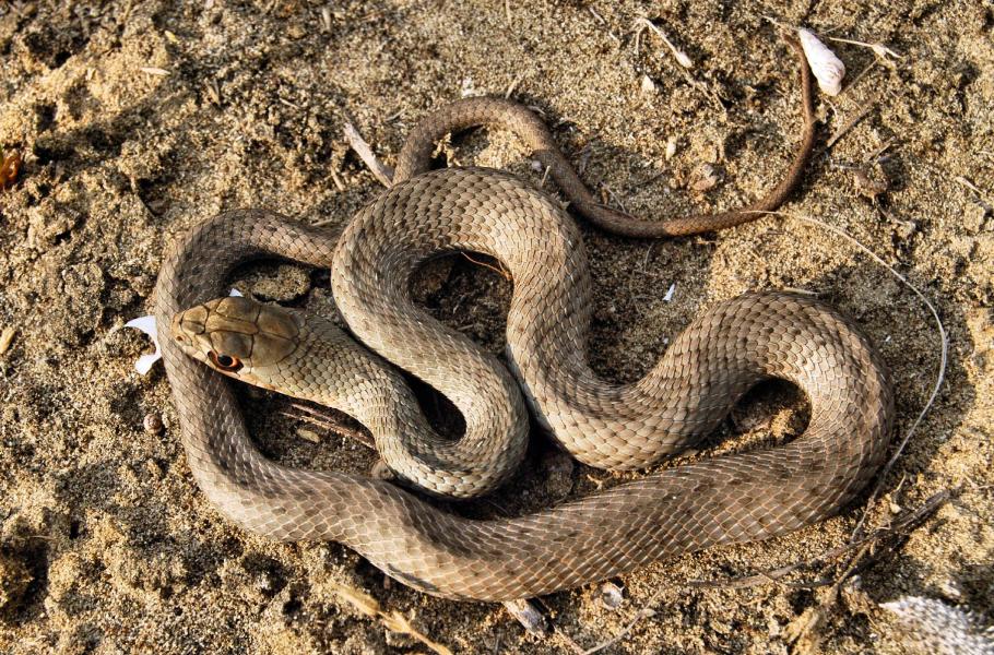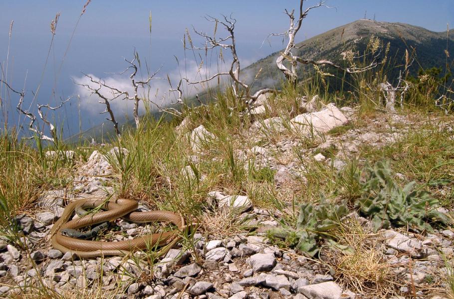 Když se vydáte dál do hor, skoro určitě zahlédnete v podrostu rychle mizející slabě jedovaté hady se zadními jedovými zuby (opistoglyfní typ), tzv. šírohlavce Malpolon insignitus. Tento druh jsem zde ale bohužel zaznamenal hlavně v podobně několika kusů přejetých na cestě. Šírohlavci jsou charakterističtí zejména nápadně velkýma očima s kulatou zornicí, jenž slouží pro dobrou orientaci v terénu a při lovu přirozené potravy, kterou jsou různé druhy ještěrek.