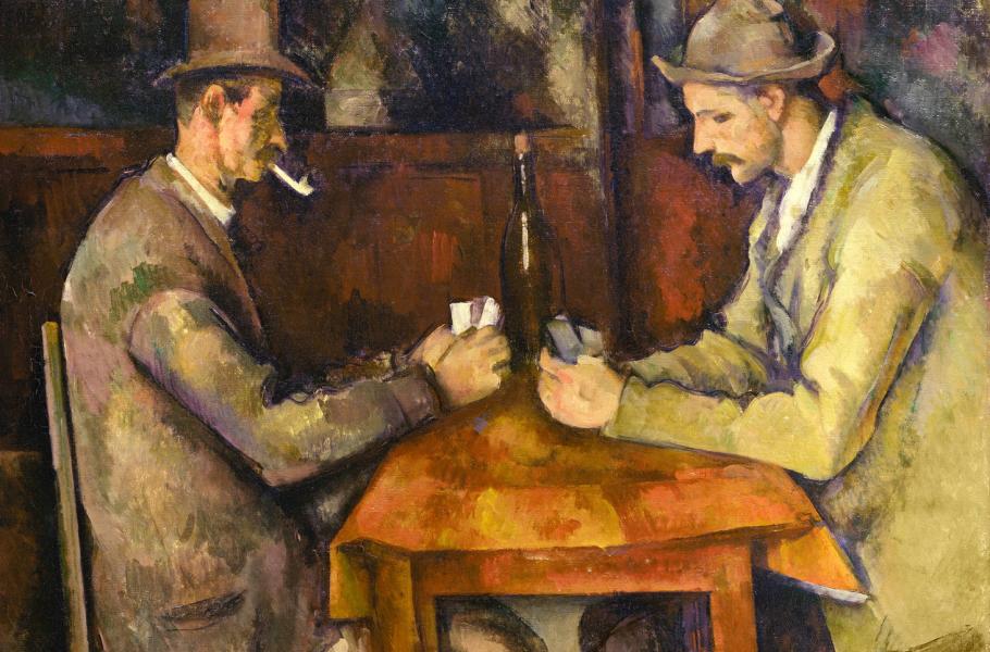 V 90. letech 19. století vytvořil postimpresionista Paul Cézanne sérii pěti obrazů zachycujících totéž téma – provensálské rolníky hluboce ponořené do karetní hry. Z jejich tváří vyzařuje koncentrace, ale zároveň klid a rozvaha. Plátna se liší velikostí, počtem hráčů i prostředím, v němž se setkávají. Každopádně, nejdražší dílo z uvedené série si v roce 2011 pořídila katarská královská rodina za předpokládaných 250 milionů dolarů. (zdroj: Wikimedia Commons, PDM 1.0)
