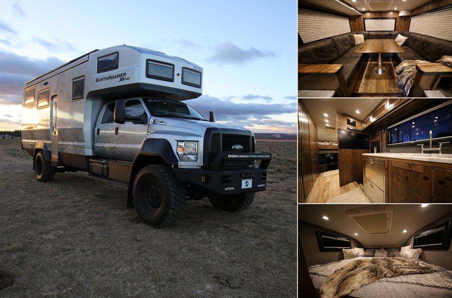 EarthRoamer se specializuje na přestavbu pickupů Ford na obytné speciály, které dokážou projet jakýkoli terén a nabídnou zákazníkům komfortní základnu pro extrémní cestování. Jejich EarthRoamer XV-HD je bestie dlouhá přes deset metrů, která má základ ve Fordu F-750. Ten pod přední kapotou nosí vidlicový naftový osmiválec o objemu 6,7 litru s výkonem 243 kW (330 k). Na zádi je pak upevněna kabina z laminátu. Ta je pro větší pevnost vyráběna v jednom kuse bez jediného spoje. Uvnitř je vše, co byste čekali od luxusního hotelu – od klimatizace a podlahového vytápění přes luxusní obložení dřevem, televize, velkou koupelnu a toaletu.