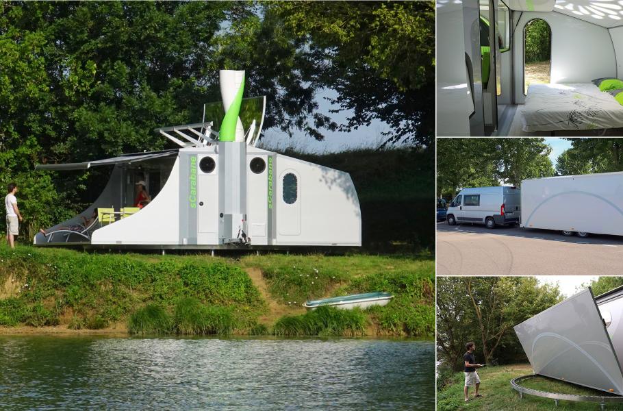 Na první pohled vypadá francouzský projekt sCarabane jako běžné i když poněkud futuristicky vyhlížející stacionární obydlí. Ve skutečnosti jde o koncept vysoce sofistikovaného soběstačného karavanu využívajícího slunce a vítr pro výrobu energie. Aby dosáhl na co možná největší množství energie, lze jej natáčet za sluncem, větrem či dle vašeho přání. Rozložení karavanu na speciální kruhovou vodící konstrukci trvá pouhou půlhodinku. Karavan je vybavený všemožnými technologiemi pro výrobu zelené energie – od parabolického zrcadla využívajícího sluneční paprsky pro ohřev vody až po solární panely a větrnou turbínu na výrobu elektřiny. Vývojáři do budoucna slibují také řešení pro sběr dešťové vody a recyklaci té odpadní. Celý koncept je ale zatím stále ve fázi vývoje a není tak jasné kdy a zda vůbec bude uveden na trh.