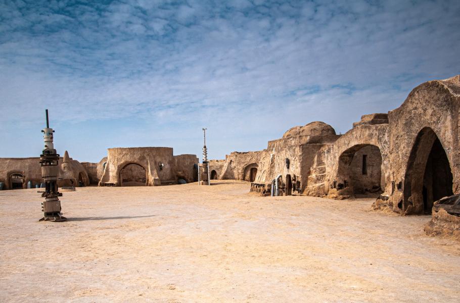 Režisér George Lucas se v 70. letech vypravil do Tuniska, protože šlo o levnou lokalitu pro filmování v pouštích, které potřeboval. Severoafrická krajina a unikátní berberská architektura ho však uchvátily natolik, že po tamním městě Tataouine pojmenoval fiktivní pouštní planetu Tatooine. V 90. letech se pak rozhodl v odlehlé oblasti Nefta na západě Tuniska postavit vlastní město Mos Espa (na snímku) a kulisy tam zůstaly dodnes, ničí je však drsné klima. Před deseti lety dokonce Tunisko vyhlásilo kampaň, která má zajistit peníze na záchranu filmového městečka. (foto: Shutterstock)