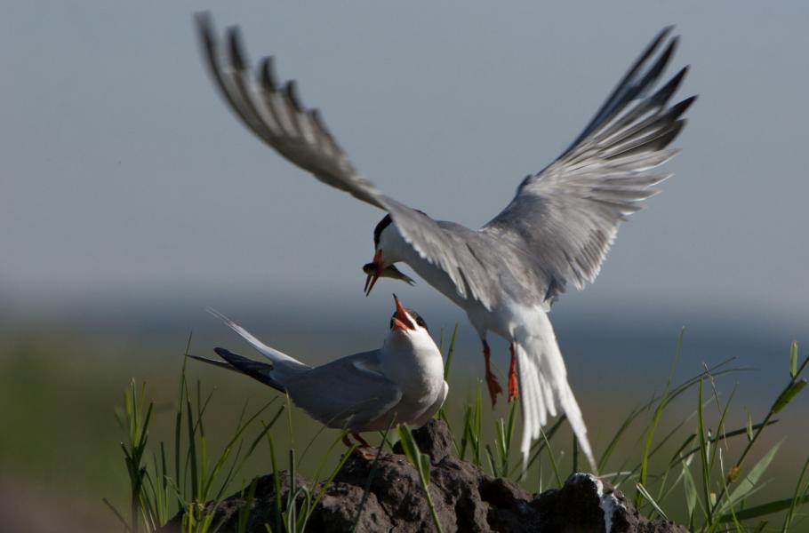 Rybák nabírá výšku a prchá, jenže v patách má hned tři racky. Ti dotírají tak dlouho, dokud unavený obránce větší rybku neupustí. Mezi racky se ihned rozpoutává divoká honička, která končí v letu a ve spěchu polknutou rybou. Okradený rybák se mezitím spouští z výšky dolů s prázdným žaludkem. Musí ulovit něco menšího – aby stačil prchat před dotěrnými zloději, nebo mohl úlovek polknout i při prudkých úhybných manévrech. Na usednutí s větším úlovkem není ani pomyšlení.