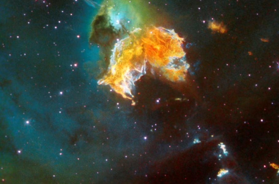 Vypadá jako Pac-Man, který si prokusuje cestu vesmírem. Ve skutečnosti jde o pozoruhodný objekt označovaný jako N 63A – relativně mladý pozůstatek supernovy, která divoce explodovala ve Velkém Magellanově mračnu.