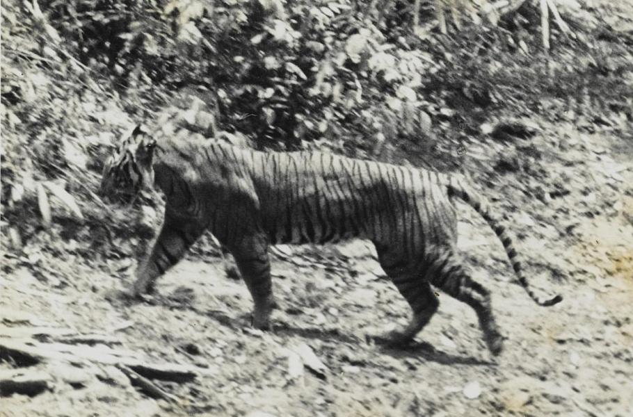 Tygr javánský (Panthera tigris sondaica) byl podobně jako další ostrovní poddruhy relativně malý. Při délce do 250 cm vážili samci asi 120 kg a samice kolem 100 kg. Vyhuben byl v 70. letech minulého století. Fotografie z roku 1938 z indonéského Národního parku Ujung Kulon. (foto: Wikimedia Commons, Andries Hoogerwerf, PDM 1.0)