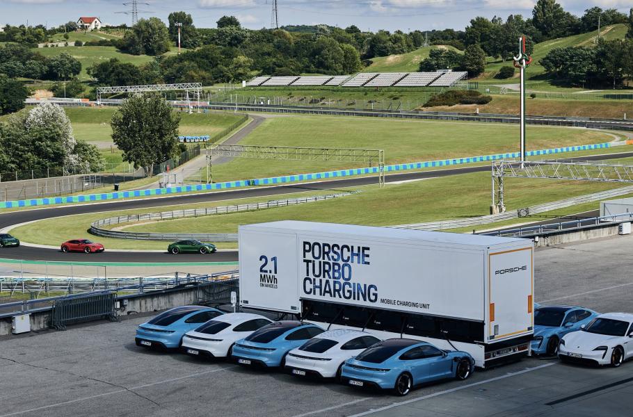 Porsche proto vyvinuli pozoruhodné velké mobilní 2,1 MWh nabíjecí stanice, v podobě návěsu pro kamion. Po nezbytných testech postavili flotilu sedmi těchto nabíjecích stanic, která už má za sebou zhruba 5 tisíc nabíjecích operací. Některé z nich přitom proběhly za extrémních podmínek, při teplotě až mínus 40 °C.