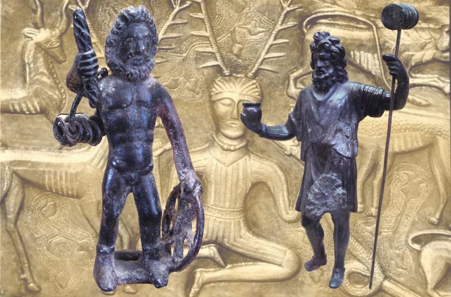 Vlevo bronzová soška Taranida s typickými atributy, vpravo soška Sucella s pohárem a palicí.