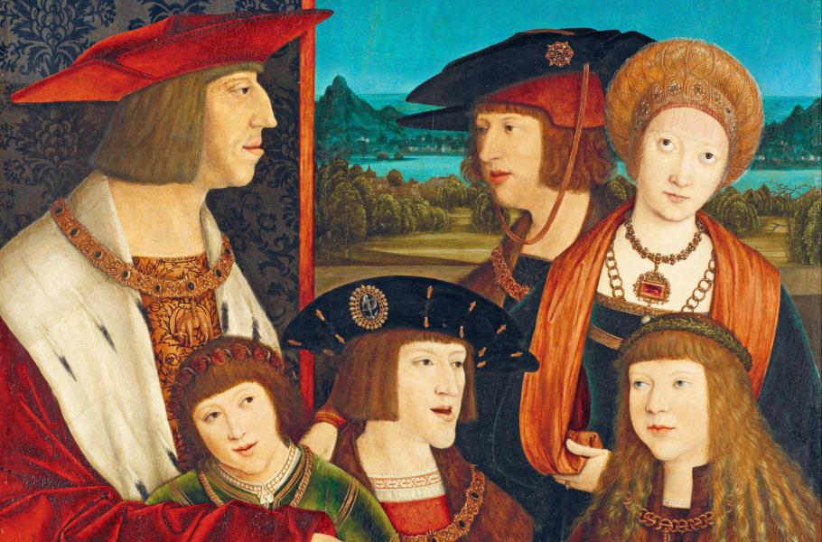 Maxmilián I. Habsburský se svou rodinou - Filipem I. Sličným, Marií Burgundskou, Ferdinandem I. Habsburským, Karlem V. Habsburským a Ludvíkem Jagellonským. (zdroj: Wikimedia Commons, Bernhard Strigel, PDM 1.0)