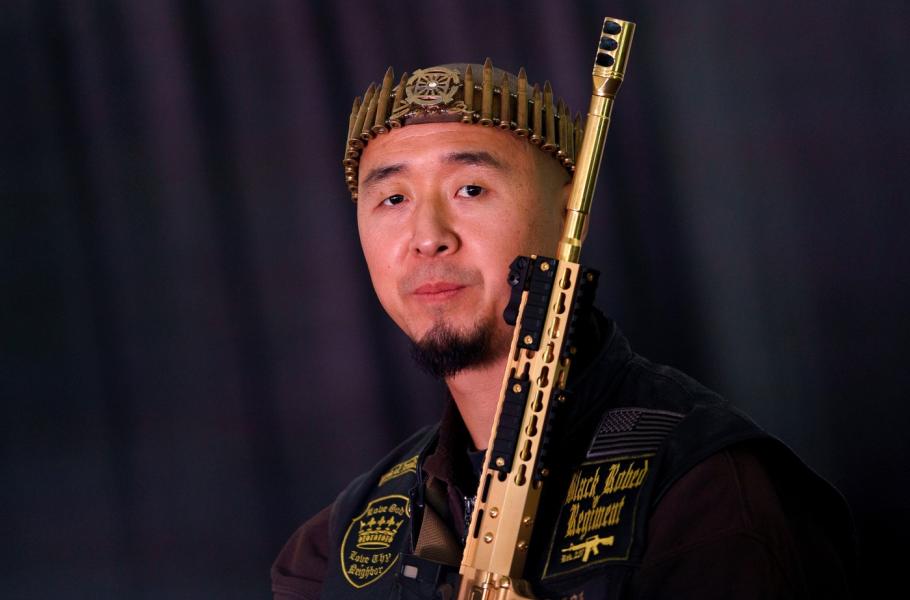 Po smrti svého syna se Mun Hjong-džin a jeho žena odtrhli od Církve sjednocení a v roce 2015 založili vlastní náboženskou organizaci, s názvem Rod of Iron neboli „železná tyč“. Jejich specialitou se stalo propojení víry se zbraněmi: Mun například nosí korunu z nábojnic a bohoslužby vede obtěžkán puškou AR-15, zatímco věřící si do kostelů berou vlastní zbraně. Zmíněná náboženská skupina mimo jiné velebí Donalda Trumpa a pomáhala organizovat útok na Kapitol z roku 2021. (foto: Profimedia)