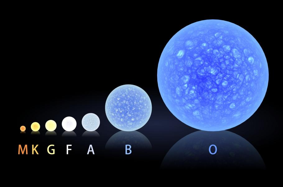 Srovnání typických velikostí hvězdných tříd hlavní posloupnosti. Hvězdy typu O mají povrchovou teplotu kolem 50 000 °C a mohou být až milionkrát zářivější než Slunce (typ G). Hvězdy typu B mají povrchovou teplotu kolem 20 000 °C a mohou být až desettisíckrát zářivější než naše mateřská hvězda. (ilustrace: NASA’s Goddard Space Flight Center, CC BY 4.0)