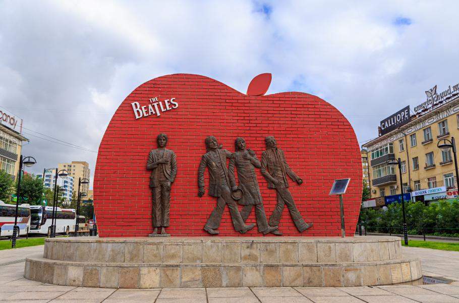 Hlavní ulice se odtud rozbíhá dál, zařezává se hlouběji do města a končí na náměstí před velkým obchodním domem. Tam prodávají vše, co se týká Mongolska, od tradičních šperků přes stolní hry, zbraně, kožešiny až po různé drobnosti. Prostranství zdobí také poměrně nečekaný památník: Z cihlového jablka hledí čtyři podobizny členů kapely Beatles. Kdysi se totiž právě tady kšeftovalo s jejich deskami, a tak si fanoušci chtěli slavnou éru připomínat i sochou.