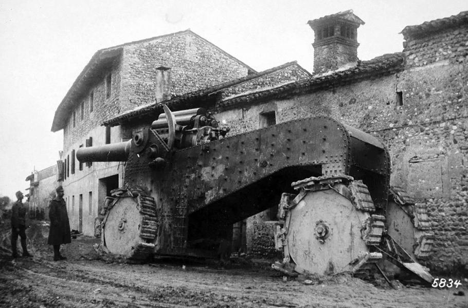 Rakousko-uherští vojáci si prohlížejí houfnici Obice da 305/17 modello 16, kterou za sebou zanechala ustupující italská armáda.