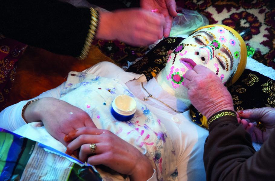 Proces zdobení nevěsty a finální podoba líčení, které trvá zhruba dvě hodiny a na němž se účastní jen ženy z nevěstiny rodiny.