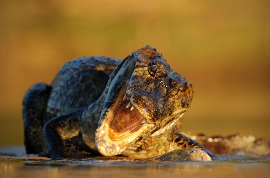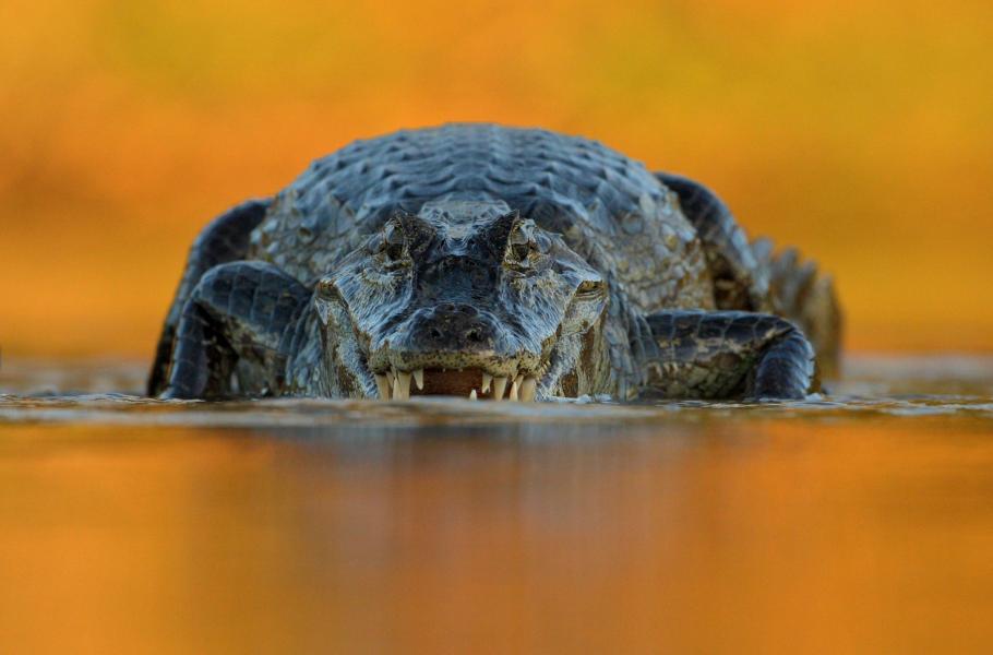 S kajmanem yacaré jsem se u břehů pantanalské řeky Rio Negro seznamoval pozvolna a s velkým respektem. Postupně jsem ale setřepal strach a snažil se dostat kajmanovi víc a víc „na kůži“. Už proto, že tento menší příbuzný krokodýlů je výrazným představitelem brazilské divočiny