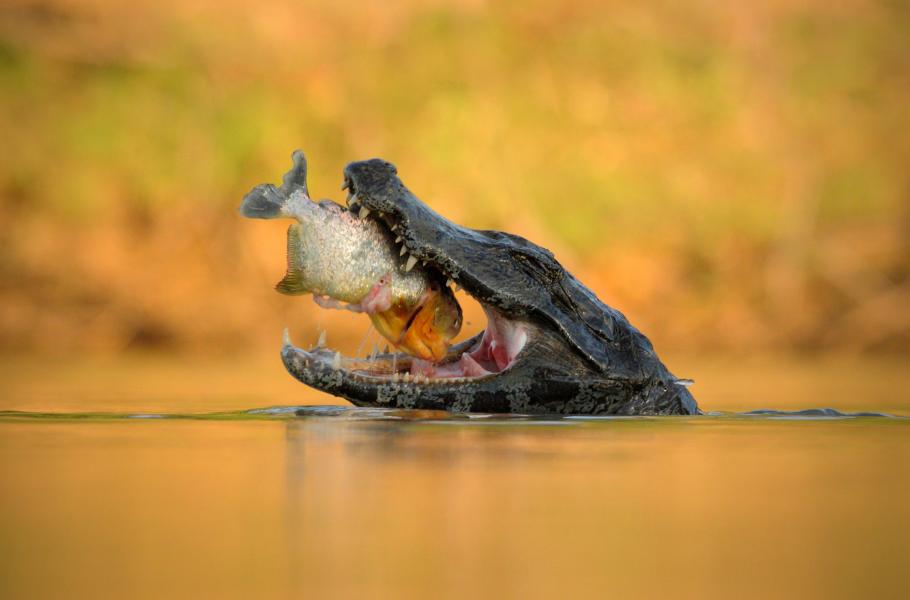 Krokodýli žijí na Zemi bez větších změn již sto milionů let. Jejich typický svalnatý ocas, podlouhlé čelisti s ostrými zuby a jedinečná síla jsou vlastní i kajmanům yacaré, kteří tak jsou velkou atrakcí Pantanalu. Obvykle se s nimi můžete setkat, jak tiše plavou těsně pod hladinou – z dva až tři metry dlouhého těla v tom okamžiku vyčuhuje pouze špička čumáku a nozdry. Někdy kajmani dokonce využívají přírodních krytů. Schovávají se například za rostliny kvetoucí na hladině, jako jsou třeba vodní hyacinty (Eichhornia crassipes). Ke kořisti se tak dostanou co nejblíž, aniž by sami byli spatřeni.