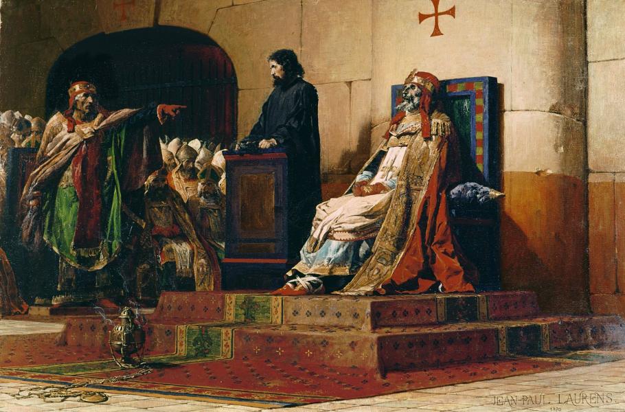 Papež Formosus se ujal stolce roku 891 na politicky nestabilním Apeninském poloostrově. Předtím se pokusil o puč proti Svatému otci Janovi VIII. a poté se přikláněl k politickým stranám, které nakonec opozice rozdrtila. Po jeho smrti proto došlo k soudu, při němž tělo „obviněného“ oblékli do papežské kleriky, usadili na trůn a prohlásili za nehodné pontifikátu. Oděv z něj následně strhali, uřízli mu prsty, jimiž žehnal, a ostatky hodili do Tibery. (ilustrace: Wikimedia Commons, Jean-Paul Laurens, CC0)