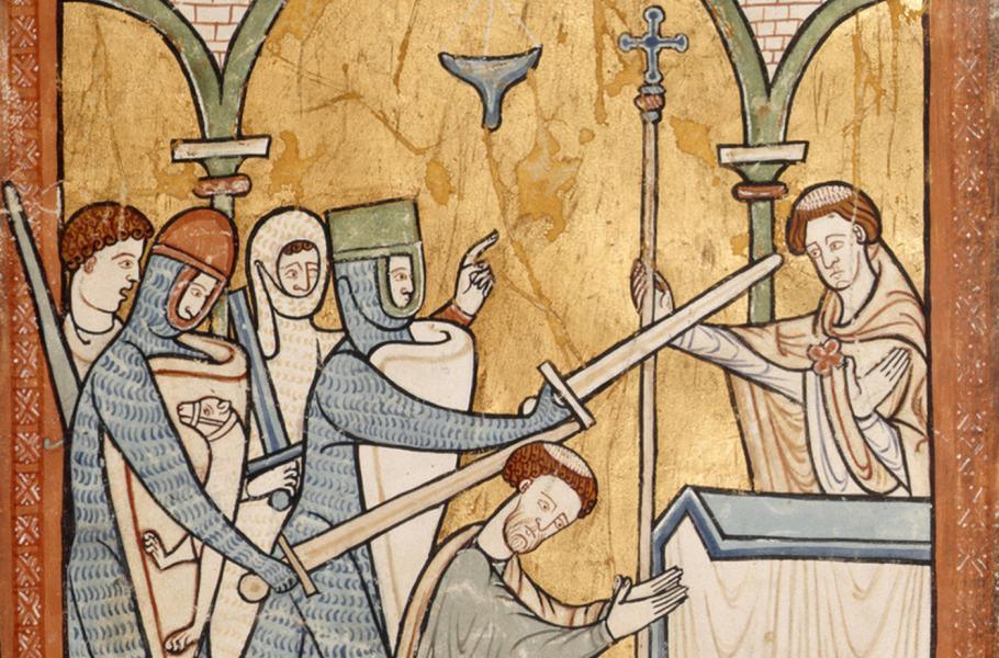 Když se anglický král Jindřich II. pokoušel omezit moc církve, jeho kancléř Tomáš Becket mu odporoval, takže ho nakonec panovníkovi rytíři v roce 1170 zavraždili. O tři roky později však papež Alexandr III. prohlásil odpůrce za blahoslaveného a později i za svatého. Není proto divu, že když v 16. století brojil proti církvi Jindřich VIII. Tudor, cítil potřebu se s Becketovou legendou vypořádat: Nechal poničit jeho svatyni a kosti světce postavil před soud, který je označil za ostatky zrádce a dal je veřejně spálit. Anglikánská církev, navzdory svému zakladateli Jindřichovi VIII., ale respektuje Tomáše Becketa jako svatého. (ilustrace: Wikimedia Commons, British Library, CC0)