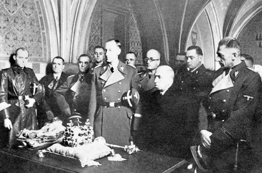 Na Svatováclavskou korunu, královské žezlo a jablko se v roce 1941 přišli kromě Heydricha (v popředí) podívat (zprava) K. H. Frank, Horst Böhme, státní prezident Emil Hácha a Kurt von Burgsdorff (v brýlích). Po Heydrichově pravici stojí Rudolf Toussaint. O tom, že by si Heydrich nasadil korunu na hlavu, neexistuje jediný doklad.