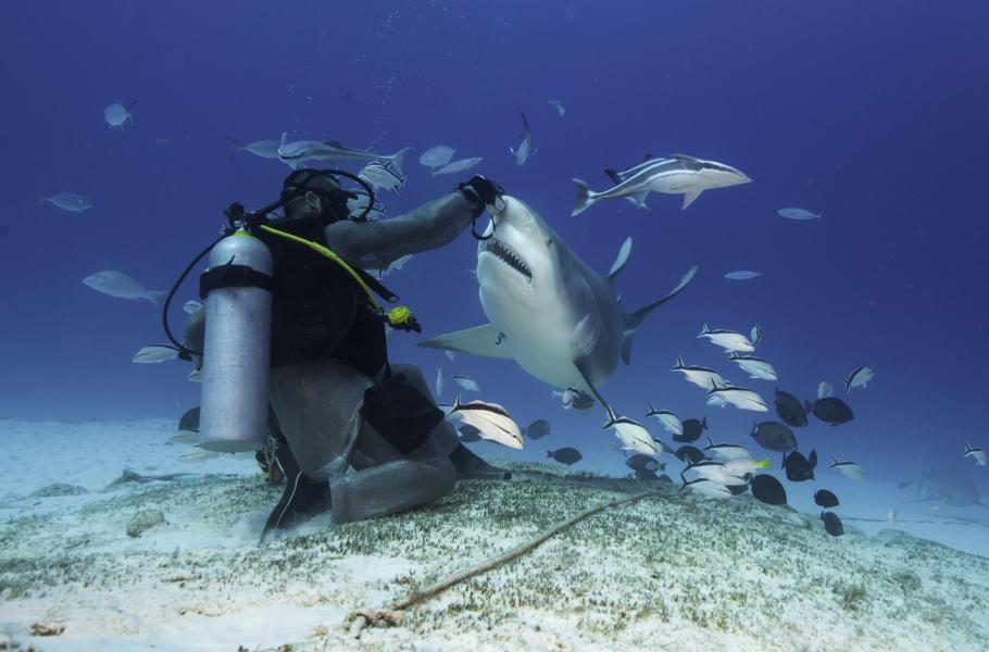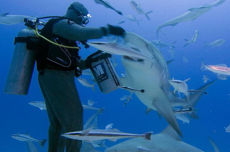 Potápěč, který žraloky býčí krmí, je vybaven nejen zkušenostmi, ale rovněž drátěnou košilí. (foto: Shutterstock)