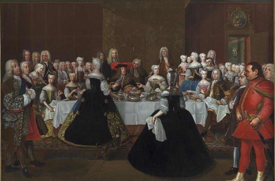 Na obrazu německého malíře Johanna Salomona Wahla „Banket na dvoře římského císaře Karla VI.“ je zobrazen výjev pravděpodobně z roku 1734. Skvěle zachycuje fakt, že podávání jídla u pompézního barokního vídeňského dvora, který čítal na dva tisíce osob, se řídilo strohou španělskou etiketou