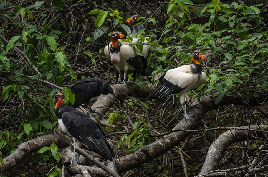 Periferně vidím Honzu, který naléhavě ukazuje na větev nad mojí hlavou: „Kondor, kondor! Bílej!“ A opravdu, svým přísným světlým okem si nás měří pták, jehož zbarvení jej činí nezaměnitelným i při pozorování z velké dálky. Kondor královský (Sarcoramphus papa). Známe ho především jako bílou tečku vysoko na obloze a člověk musí mít kus štěstí, aby ho zastihl na zemi blízko mršiny. V mžiku do sebe vše zapadá, pohledem se vracíme k obrovskému kajmanovi, který se stále nepohnul ani o centimetr.