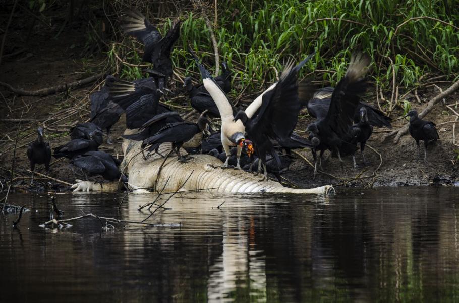 Nevnímám hejna komárů, která mně pokrývají ruce, čelo i krk. Fotím. Musím ale být opatrná. Všichni přítomní kondoři královští sice postupně překonávají plachost a slétají se na kajmana, stále však sledují naše počínání a u kořisti se vzájemně střídají. Většina jich zůstává rozsazena po okolních stromech a většinou se krmí jen jeden z nich. Nejvíc jsme jich najednou na kajmaní mršině napočítali pět. Ani jednou jsme přitom nezaznamenali sebemenší náznak agrese nejen vůči sobě navzájem, ale ani vůči černým kondorům, kteří však spontánně udržují uctivou vzdálenost.