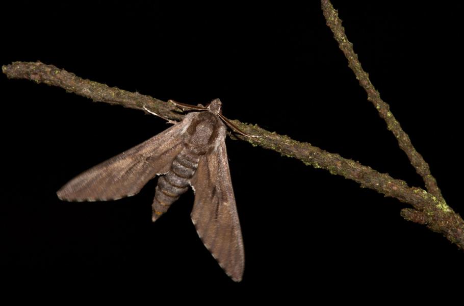 Trochu se připozdilo. Na plátně se jako herci na nasvíceném jevišti objevují další a další motýli. Malí, větší, protáhlí, baculatí, huňatí… Zatímco fotografuji hranostajníka bílého (Cerura erminea) z čeledi modrohlávkovitých (Dilobidae), přilétá jeho příbuzný hranostajník bukový (Stauropus fagi). Oba je zvěčňuji na staré borové větvi, když tu na kámen, kterým je zatížen cíp napnutého plátna, usedá asi sedm centimetrů velký motýl, evidentně některý z lišajů.