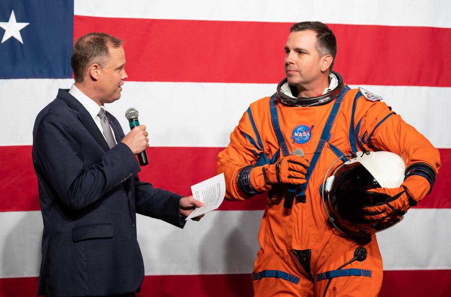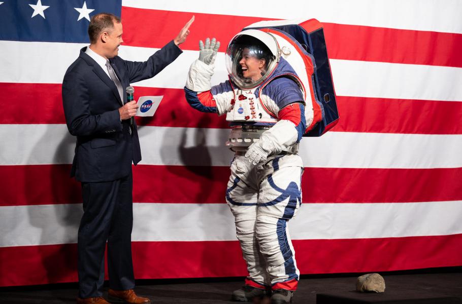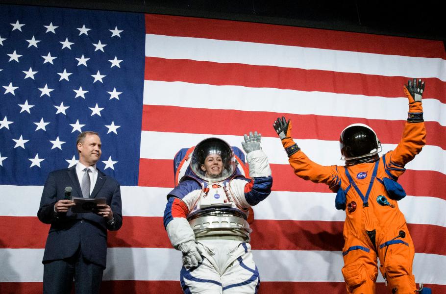 Šéf NASA Jim Bridenstine se svými spolupracovníky předvedl veřejnosti skafandry „Exploration Extravehicular Mobility Unit (xEMU)“ a „Orion Crew Survival System“, které jsou určené k výstupům na cizí světy, respektive pro starty a přistání posádek připravované kosmické lodi Orion.