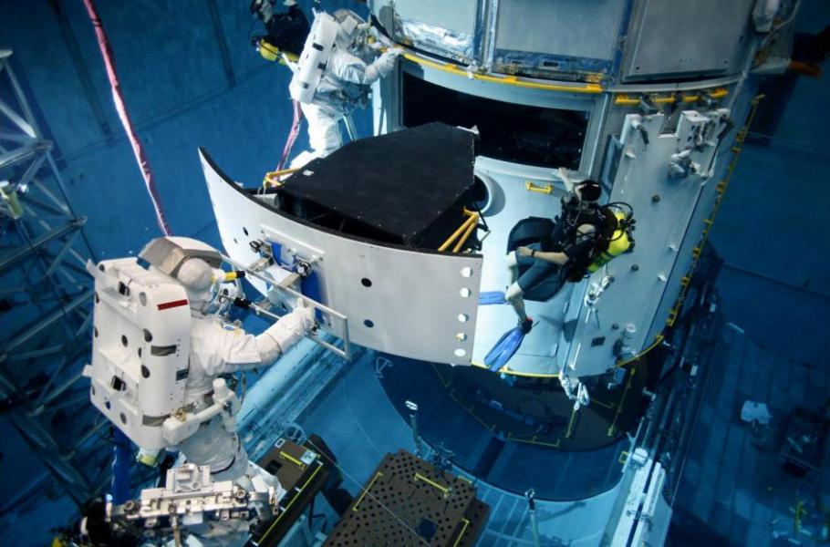 Falešný pocit beztíže, který způsobuje vztlak vody, využívají astronauti pro nácvik operací při výstupech do kosmu. Snímek zachycuje trénink choreografie nutné pro opravu Hubbleova vesmírného dalekohledu. NASA takto cvičila své astronauty nejprve v bazénu Weightless Environmental Training Facility (WETF), dnes slouží ke stejnému účelu Neutral Buoyancy Laboratory (NBL).