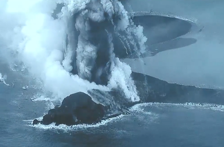 Už to vypadalo, že erupce u japonského ostrova Iwodžima vyhasínají. 23. listopadu ale došlo k nové sérii erupcí. Osud nového sopečného ostrova je tak stále otevřený. (foto: Japan Coast Guard, CC BY-SA 4.0)