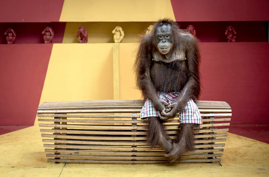 Zdánlivě roztomilým snímkem chtěl Aaron Gekoski upozornit na krutost, kterou obzvlášť v Thajsku zažívají orangutani chovaní coby turistická atrakce. Vystavovaní tvorové jsou obvykle odchyceni ve volné přírodě a po výcviku za použití drastických metod slouží k vydělávání peněz v cirkusových show. (foto: EPA, Aaron Gekoski)