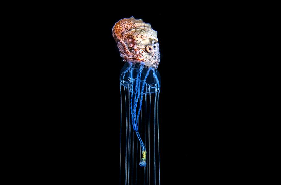 V hloubce patnácti metrů Magnus Lundgren ve skutečnosti nezachytil neznámé vodní stvoření, ale chobotnici druhu Argonauta hians a medúzu. O jejich soužití vědci zatím příliš mnoho nevědí, ale předpokládají, že chobotnice medúzu využívá buď jako zdroj potravy, nebo k obraně před predátory. (foto: EPA, Magnus Lundgren)