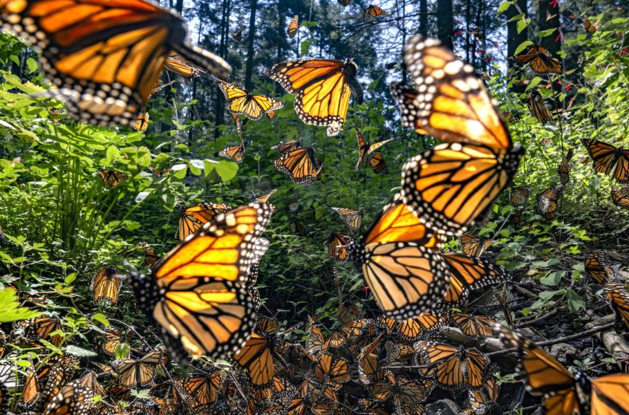 Každé jaro zaplaví rezervaci v mexickém státě Michoacán migrující monarchové stěhovaví. Zmínění motýli se před cestou náležitě posilní, takže nepotřebují potravu, ale musejí ukojit žízeň. Proto se slétají u potoků, aby nasáli vlhkost. (foto: EPA, Jaime Rojo)
