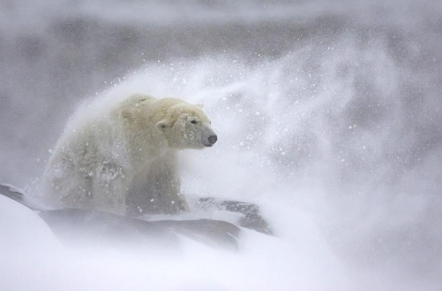 Ledního medvěda uprostřed sněžné bouře zachytil Daniel Valverde Fernández na pobřeží Hudsonova zálivu v Kanadě. Jde o jednoho z mnoha jedinců, kteří do oblasti přicházejí lovit tuleně a čekají, až zamrzne oceán. (foto: EPA, Daniel Valverde Fernández)